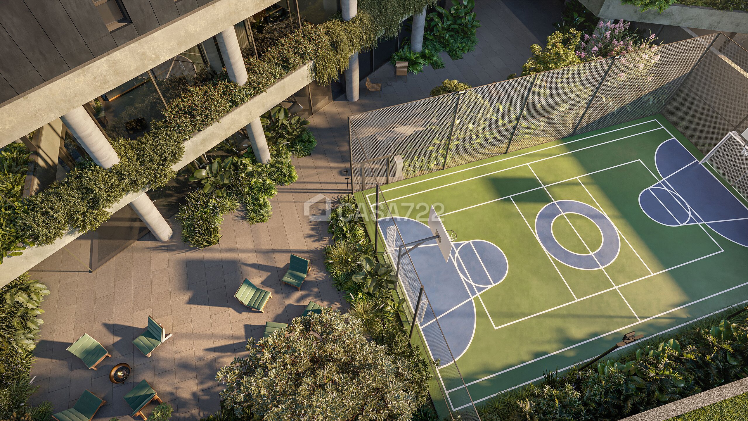 • Espaços externos equipados com mobiliário que promove contemplação, socialização e a prática de atividades físicas