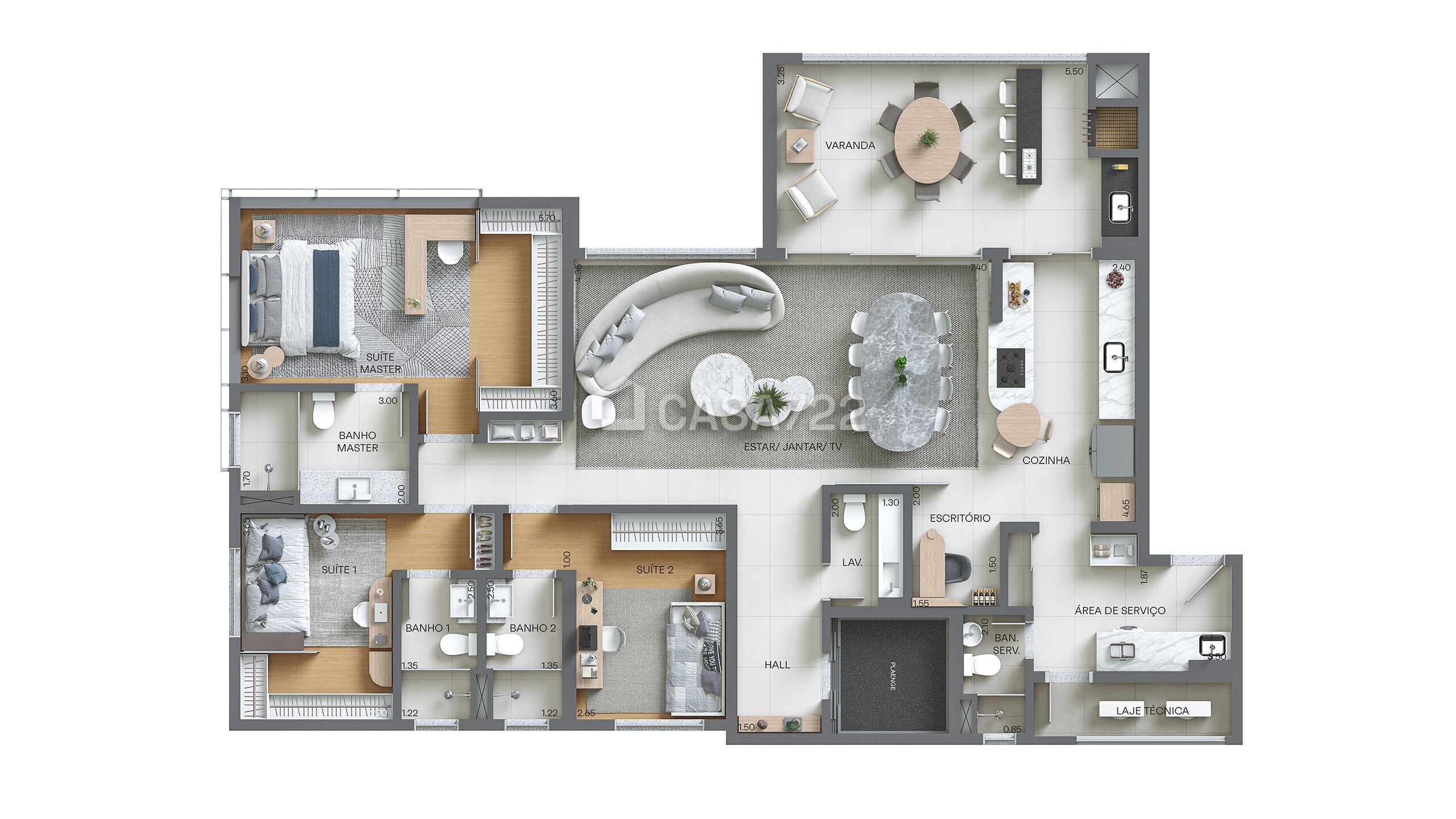 • Porcelanato acetinado 90x90cm (sala/varanda/cozinha/área de serviço/lavabo/hall/escritório/circulação)