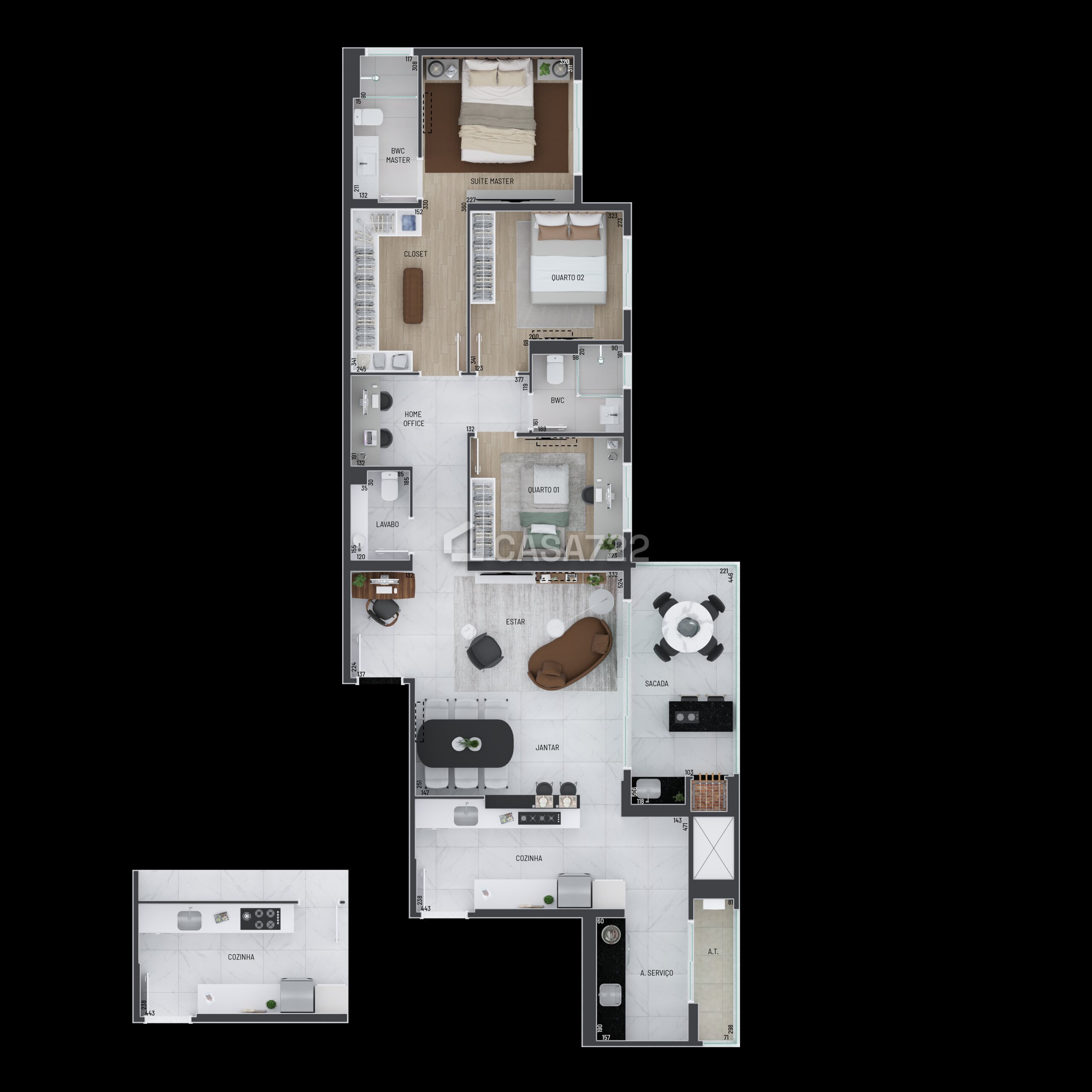 • Porcelanato acetinado 90x90 cm (sala/varanda/cozinha/área de serviço/lavabo/banheiros)