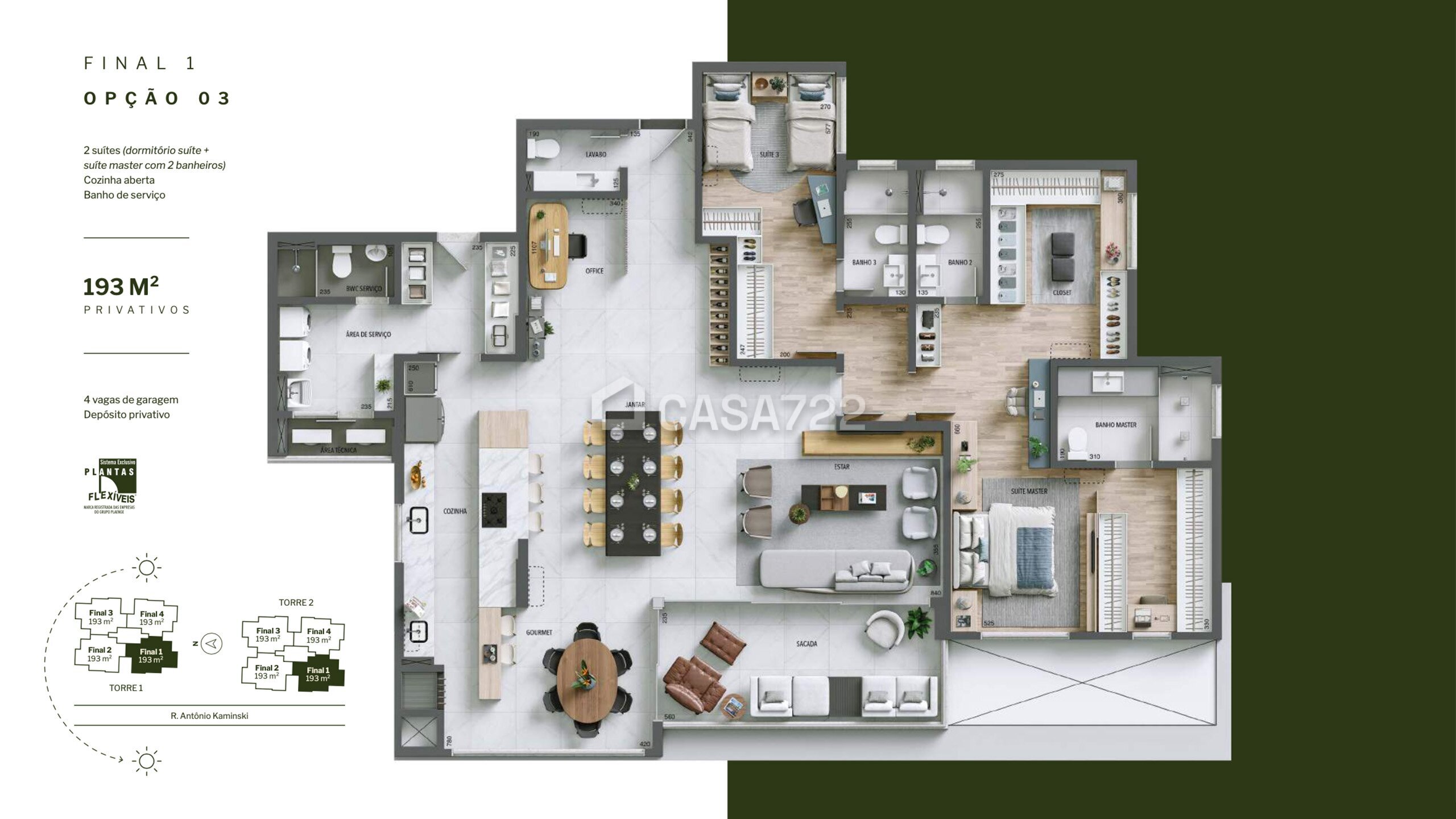 • Persianas integradas e motorizadas (nas suítes e dormitórios)